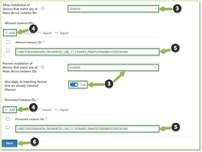 - The default rules will be displayed. Begin by selecting the dropdown beside the Device Installation Restrictions blade. Locate the Allowed Instance IDs or Prevented Instance IDs option depending on the desired outcome for USB handling, select the Add button below the desired previously listed header. A text box will be generated where you can specify the necessary device identifier. The allow or block list is only available if the Allow or Prevent installation of devices that match any of these device instance IDs security settings is set to Enabled, the prevent setting also has an additional unique setting Also apply to matching devices that are already installed (Device) that will remove already installed USB devices if they do not match the newly enforced criteria. Select Next to continue.