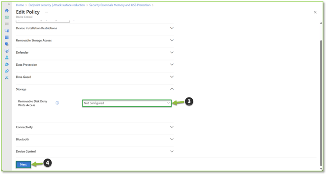 - Navigate to the Attack Surface Reduction – Intune portal, locate and select the Security Essentials Memory and USB Protection policy or an equivalent Device Control policy.