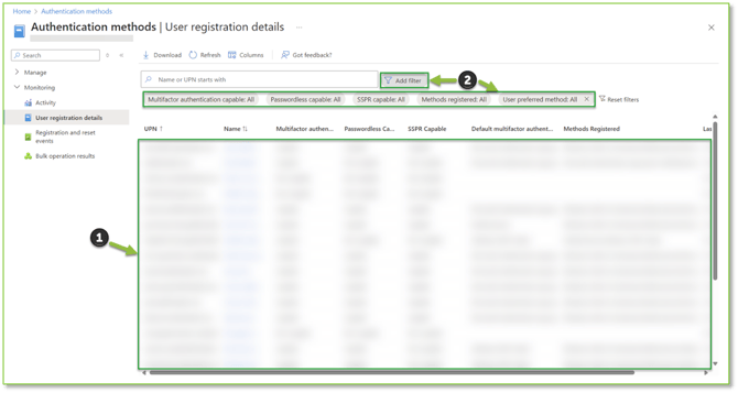 - Navigate to the User Registration Details – Azure Active Directory portal, here you will find information on the MFA methods that the associated users have currently registered, if the listed user accounts are capable of registering for one of the MFA methods, and detect any discrepancies in MFA enforcement for desired user accounts. From this page you can see the UPN (name@domainname) and Name associated with the user that has completed registration, if the has the proper licensure or capabilities to register MFA (authenticator app), Passwordless (Windows Hello for Business), or SSPR (the methods specified within the Password Reset section of AAD, this also includes information that could indicate if the user was a member of the defined SSPR policy enforcement scope). This section will also include a list of all Methods registered by the user account as well as the Last Updated Time this information had been gathered by Microsoft reporting (this metric does not indicate when the user initially registered this authentication method). Filtering can be adjusted if you know specific information related to the event you are trying to explore.