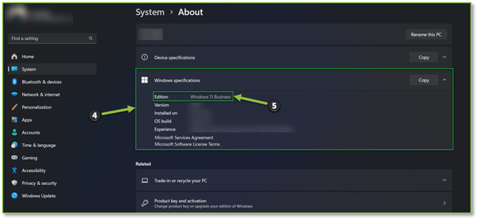 - Selecting About your PC will redirect you to the System section of the Settings utility. Locate the Windows Specifications dropdown, under the Edition subsection verify that the Operating System is running at a Windows 10 Pro or Windows 11 Pro/Business level, if not you will not be able to join this device to Intune for MDE Onboarding.