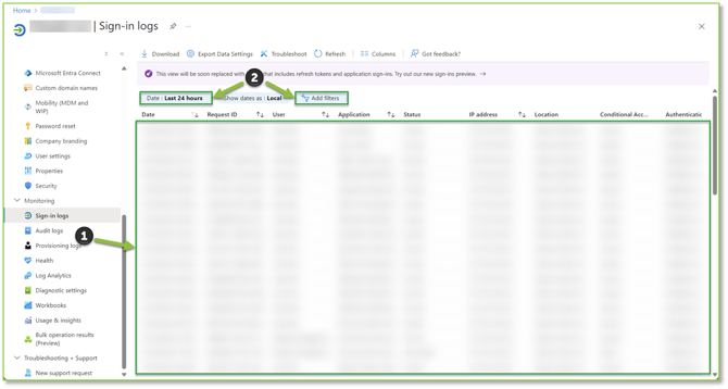 Navigate to the Sign-In Logs – Azure Active Directory portal, here you will find all authentication attempts into a Microsoft Entra tenant, which includes your internal apps and resources. From this page you will be able to identify sign-in errors and patterns that will provide valuable insight into how your users access applications and services. Additionally, you will be able to describe the activity associated with an authentication attempt by identify details such as who is performing the sign-in (the identity of the associated User or Service Principal), what resource is attempting to be accessed by the identity, etc. Filtering can be adjusted if you know specific information related to the event you are trying to explore.