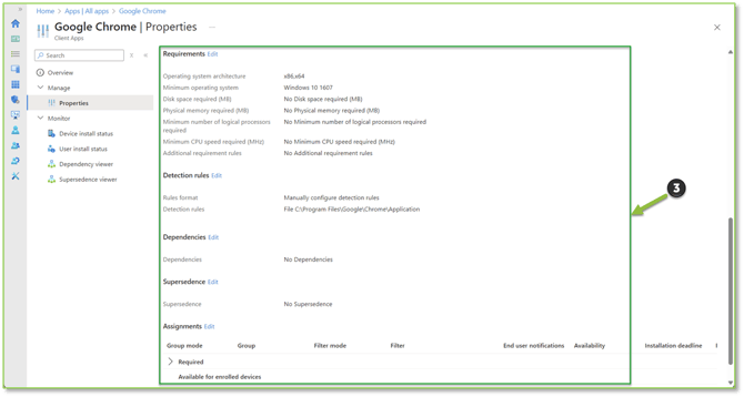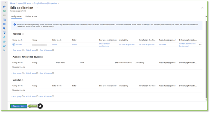- Assignments: Specifies which Groups will be required, or optional for application deployment package instillation, as well as which groups will need to have this package removed from their devices using the uninstall section.