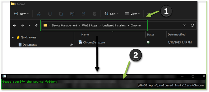 - Upon opening the application, you will be presented with a prompt to specify the Source Folder. This is simply the app folder you made in the Unaltered Installers folder. A quick way to find this is simply copy the path from the file explorer window as shown and paste it into the command prompt window. Click Enter.