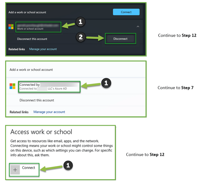 - Reference the two figures below. If you find a “Work or School account” account connected, simply click “Disconnect” as an administrator and skip to step 12. If there is no account connected, also skip to step 12. If you find a “Connected to XXXXXX’s Azure AD” account, continue to step 7. [Note: Removing these accounts will remove it from any apps the account is signed in to. If you are unable to disconnect the account, it may be managed by another organization already or the IT department may need to be involved to help.]
