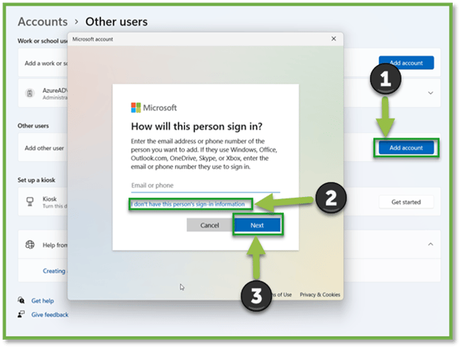 - Navigate to Accounts | Other Users. Select “Add Account”, followed by “I don’t have this person’s sign-in information”; select “Next”.