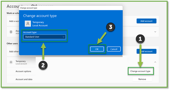 - Once created, navigate back to Accounts | Other Accounts and select the Temporary account you just created. Click “Change account type” and change it form a standard user to administrator user.