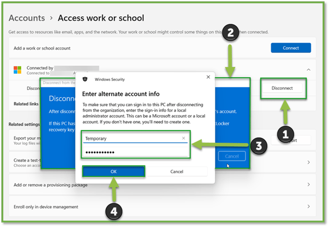 - Navigate back to Accounts | Access work or school. Select “Disconnect” on the account connected via Azure AD. Follow the prompts to continue to the disconnection, and input the temporary account credentials that was just created. In the “Email Address” field, put in Temporary and the password that was set. Select OK.