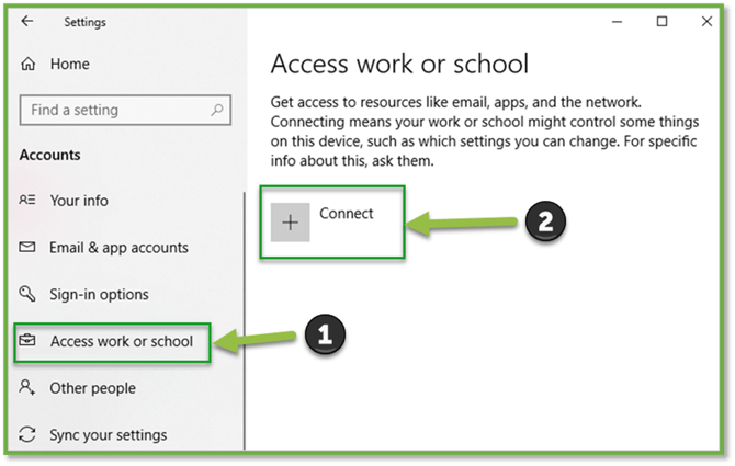 - Navigate to Accounts | Access work or school. There should be no accounts listed under the accounts page, select ‘Connect” to add your account.