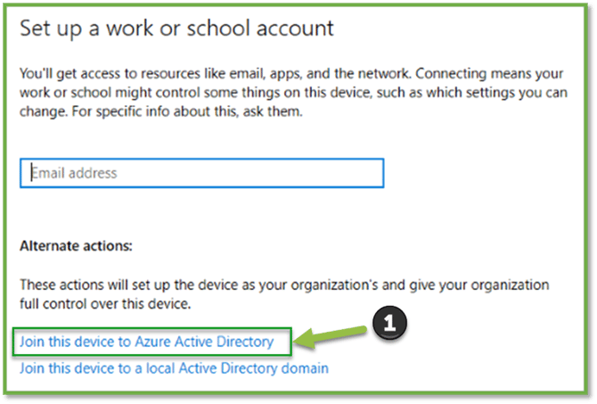 - When prompted, select the option to “Join this device to Azure Active Directory”. [Note: if there is not an option to perform this, ensure steps 5-7 were followed to completion, along with ensuring the account logged has administrative privileges.]