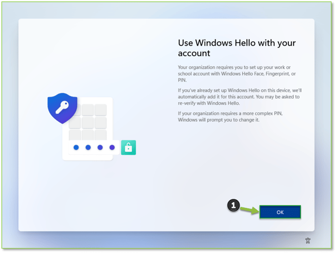 - After completing Autopilot enrollment, you'll see a prompt asking you to set up a Windows Hello PIN. This is required by your organization as part of Windows Hello security. Select OK to proceed to creating a Windows Hello PIN.