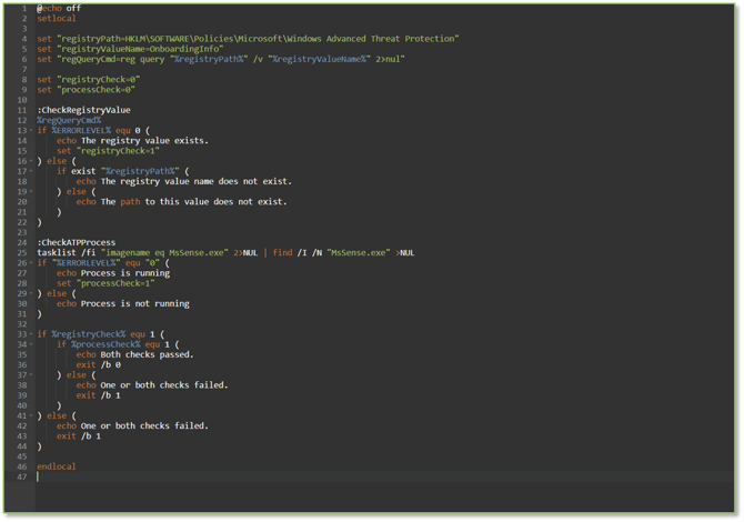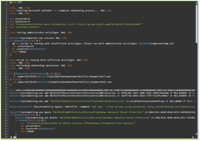 - Leveraging the previously extracted WindowsDefenderATPOnboardingScript.cmd script from the MDE Detection and Remediation Script steps, we will want to open the file directly from a preferred text editor.