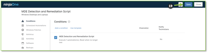 - If done correctly the condition should be listed within the section, select Save to finalize the creation of the conditional based policy for the MDE Detection and Remediation Script RMM Deployment.
